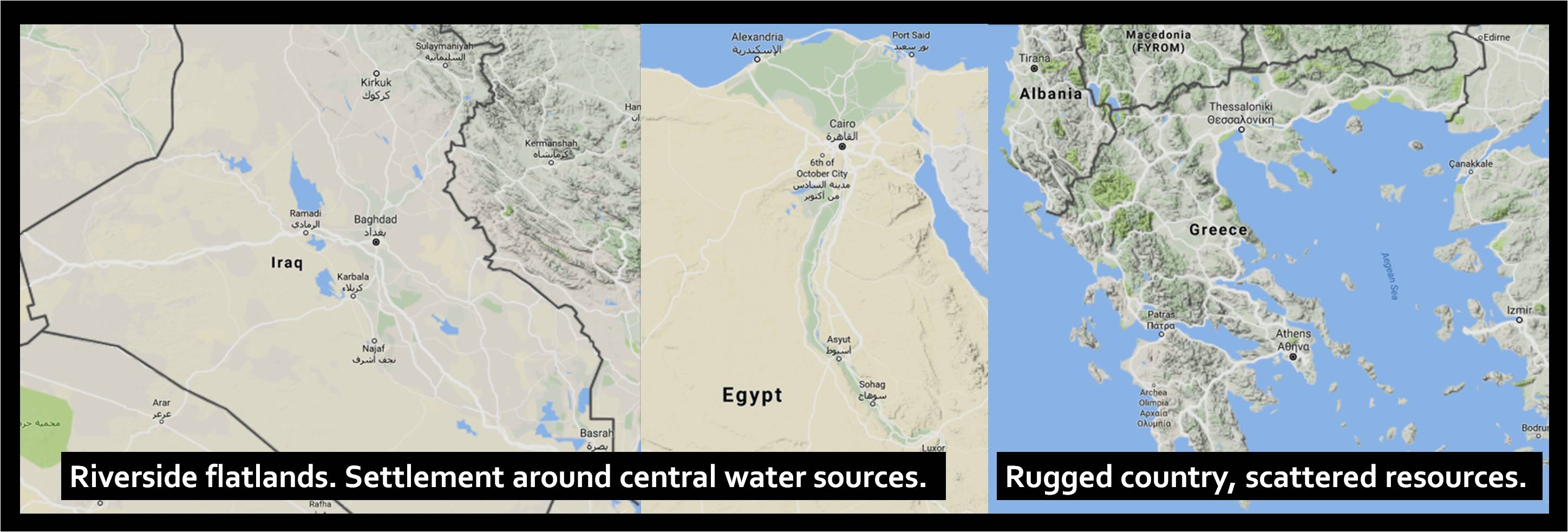Ancient Egyptian geography is pretty simple. There were cities situated along the Nile, and then – other – uh – cities situated along the Nile. And in Mesopotamia, there were cities located along the Tigris and Euphrates, and, also, cities located along the Tigris and Euphrates. I’m exaggerating, of course, but extremely arid lands with singular sources of fresh water tend to have pretty predictable population distributions. Greece is a different story entirely. And every single history of Ancient Greece – every attempt to explain what made the Greeks a unique society in the ancient world – begins with geography. [music]