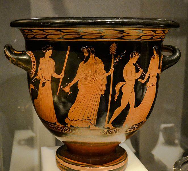 An Attic red figure bell krater of Dionysus with an ivy-wrapped thyrsis, flanked by a satyr and maenads. Photo by Dorieo Wikimedia Commons, (License CC-BY-SA 4.0).